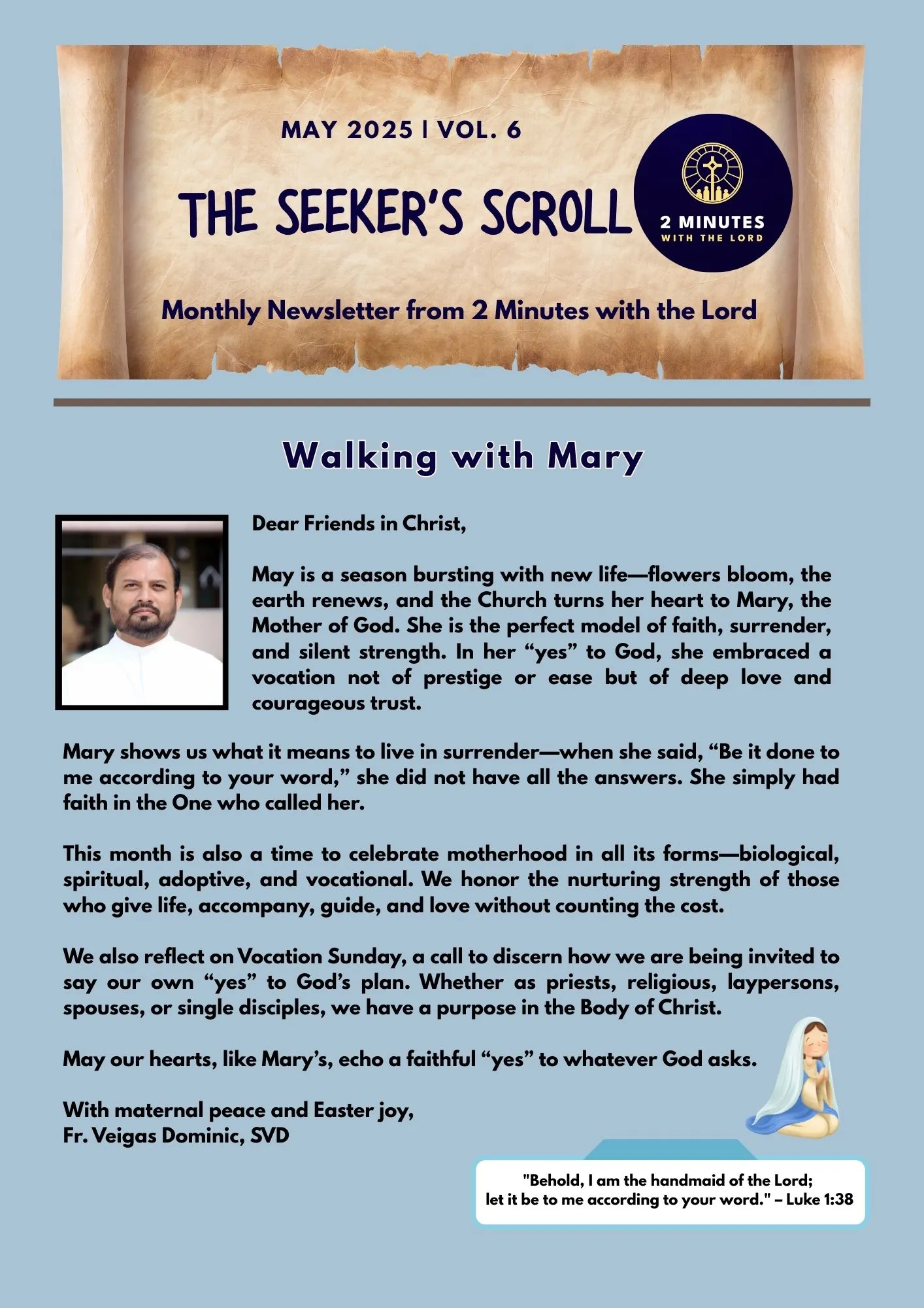 invites you on a journey of "Walking with Mary" , our perfect model of faith, surrender, and courageous trust. Embrace May as a season for spiritual discernment and growth , echoing Mary's faithful "yes" to God's plan.