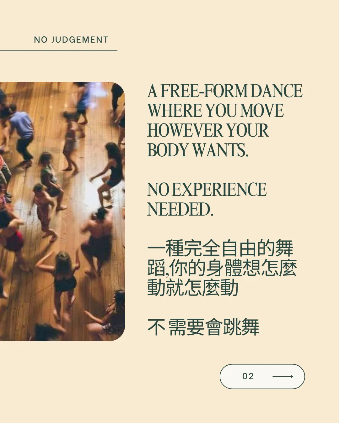 🌿 活動內容:快樂能量滿滿的 House 音樂,以及一小時的「靜默狂喜舞蹈」,邀請大家閉嘴開身,以最自然的方式與音樂、身體連結。