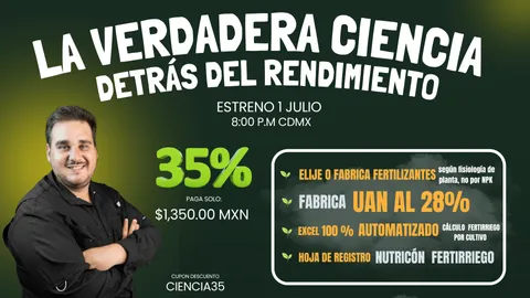 Curso especializado para aprender a elegir fertilizantes según la etapa del cultivo, y fabricar tu propio UAN al 28% ¿Estás aplicando los fertilizantes correctos… en el momento equivocado? Este curso te va a cambiar la forma de ver la nutrición vegetal. Aquí no se trata solo de NPK, sino de entender qué necesita la planta en cada etapa fisiológica y elegir el fertilizante más eficiente según su fase de desarrollo. Lo que vas a aprender: Fisiología práctica para el campo Vas a comprender qué pasa dentro de la planta cuando brota, florece, cuaja fruto o entra en estrés, y por qué la nutrición debe cambiar en cada etapa. Esta información te permitirá tomar decisiones inteligentes y evitar aplicaciones innecesarias que solo encarecen tu producción. Errores comunes en fertilización ¿Sabías que muchos productores pierden hasta el 70% de la efectividad de sus fertilizantes por aplicarlos en el momento equivocado? Aquí verás los errores más frecuentes, para que tú no los repitas. Cómo elegir un fertilizante según la fisiología del cultivo Aprenderás a identificar qué tipo de fertilizante (ácido, catiónico, de rápida o lenta liberación, rico en K, en N, etc.) conviene usar según el cultivo, el tipo de suelo y la etapa fenológica. Vas a dejar de aplicar fertilizantes genéricos solo “porque así se hace”. Caso real Te mostraré imágenes y comparativas entre una planta alimentada con una fórmula genérica vs. otra alimentada según su fisiología. La diferencia es tan clara, que no vas a volver a ver la fertilización con los mismos ojos. Además, vas a aprender a: ✅ Fabricar tu propio fertilizante UAN al 28%, un fertilizante nitrogenado altamente efectivo y ampliamente utilizado en cultivos extensivos, hortalizas y frutales. ✅ Usar un Excel automatizado de fertirriego, con los principales cultivos precargados para que calcules dosis exactas según tu sistema. ✅ Llevar el control completo con una hoja de registro de nutrición, para planear y registrar cada aplicación con orden y precisión.