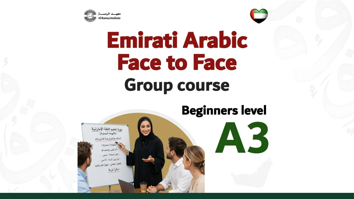 A3 is an upper beginner course. Students will level up their about workplace, meetings and other topics like car accident, phone call, emirati outfits. In addition of grammar lessons like impartive tense and connecters words.