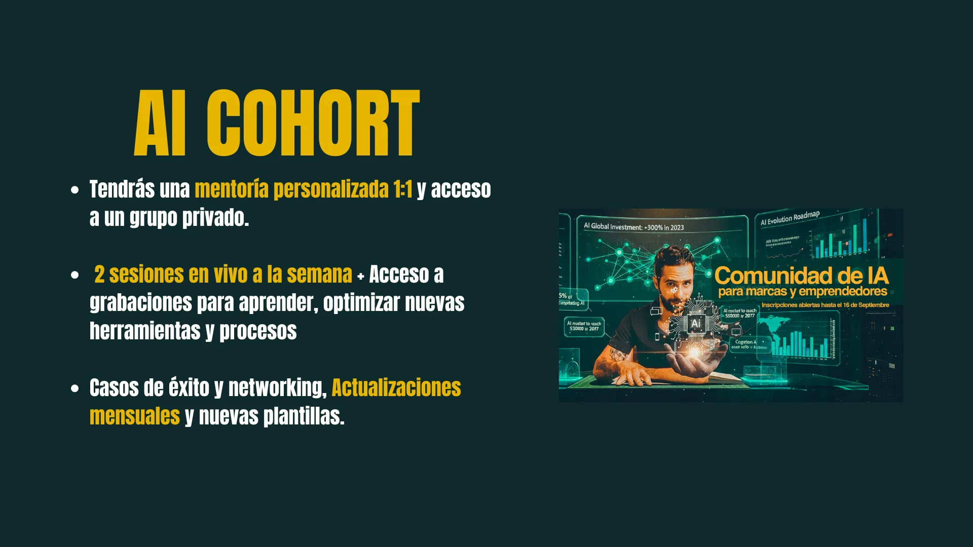 En nuestra comunidad de IA te enseñamos a usar herramientas y flujos inteligentes que multiplican tu productividad, aceleran tu marketing y hacen que tu marca brille con contenido único.