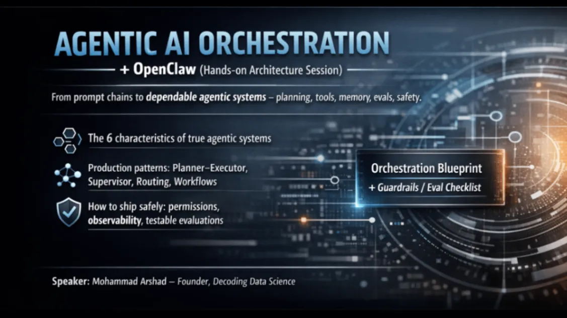 You’ll learn the 5–6 core characteristics of true agentic systems, the orchestration patterns used in production (planner–executor, supervisor, routing, multi-step workflows), and how to implement safety + reliability through permissions, observability, and testable evaluations. Expect practical examples, architecture thinking, and clear “do this next” takeaways.