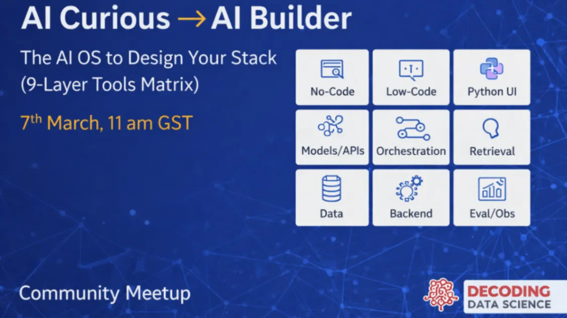 In this community meetup, Mohammad Arshad will share the AI Operating System (AI OS) he uses to move from prototype → MVP → production, using a practical 9-Layer AI Tools Matrix that maps the modern AI stack end-to-end (UI, model APIs, orchestration/agents, RAG, backend, evals/observability, and governance).