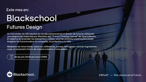 Un microtaller de 120 minutos en donde exploraremos el diseño de futuros utilizando una adaptación mejorada por Blackbot del “Future Thinking Canvas” de SparkzWorks. El objetivo es entender los elementos y utilizar esta herramienta creativa para poder imaginar los futuros sobre: tu compañía, tú profesión o tu vida.