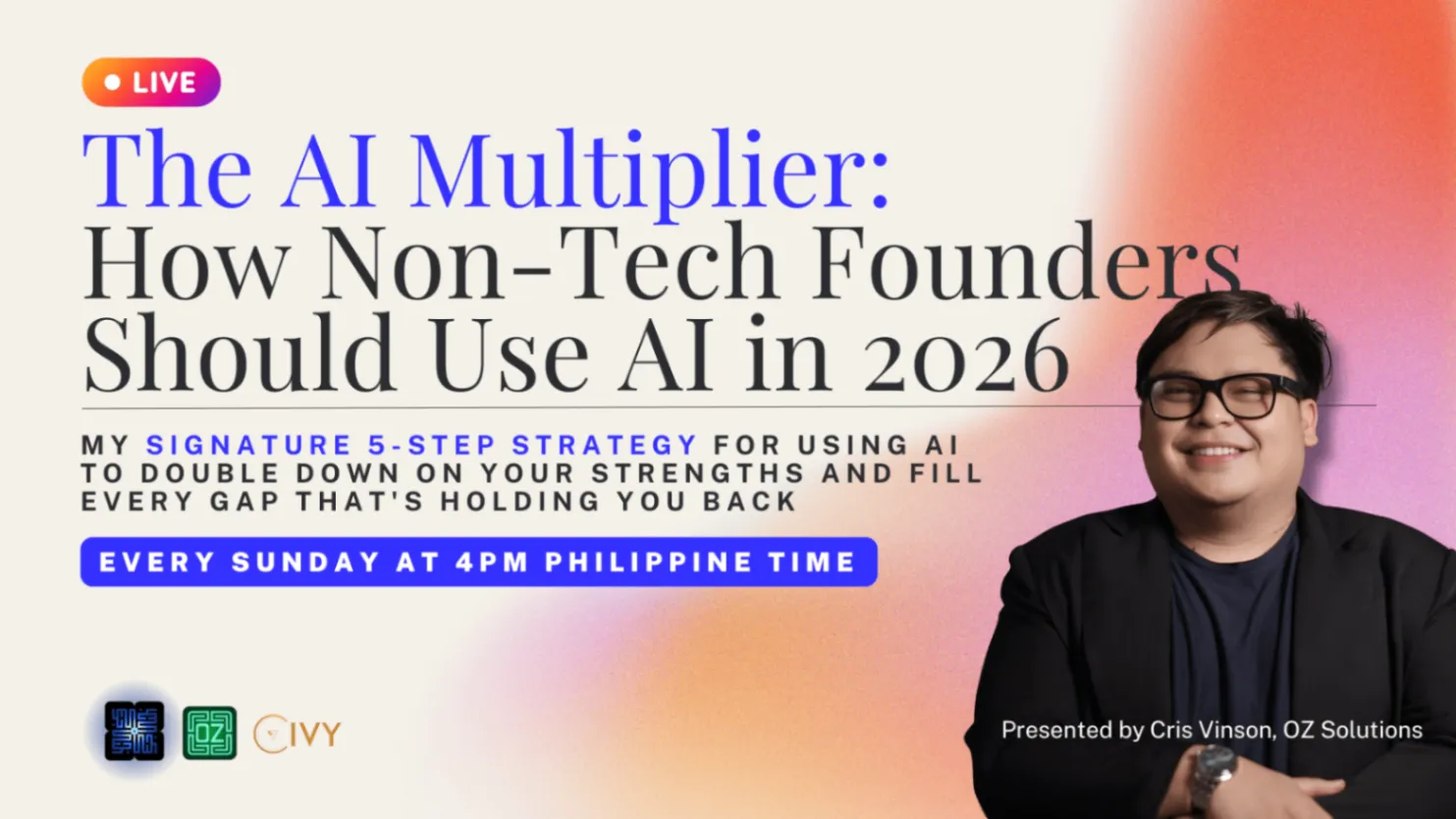 In this free 60-minute session, Cris Vinson breaks down the exact framework non-tech founders are using right now to do more in less time with AI — without learning to code, without hiring a developer, and without signing up for 47 different tools.