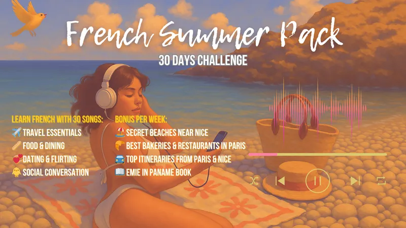 Learn real French with 30 songs in 30 days โ from travel essentials to dating, slang, food, and social life.