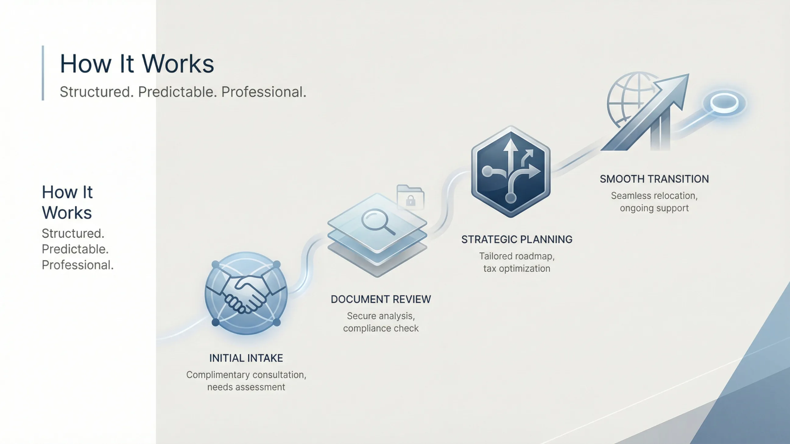 1. Initial Intake Share your return timeline, current location, and financial snapshot — we'll identify the key risks and compliance gaps.