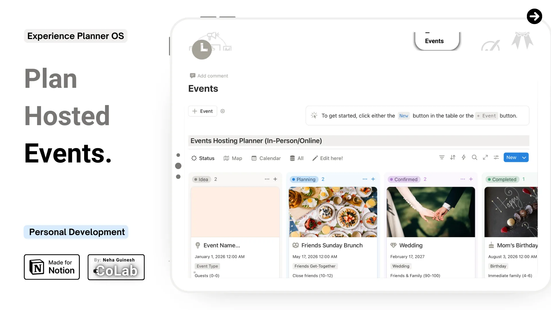 Planning an event involves coordinating multiple moving parts — ideas, dates, guests, locations, progress, and follow-ups. This Events Hosting Planner gives you a structured, centralized system to manage every detail in one workspace, so you can track events clearly and efficiently.