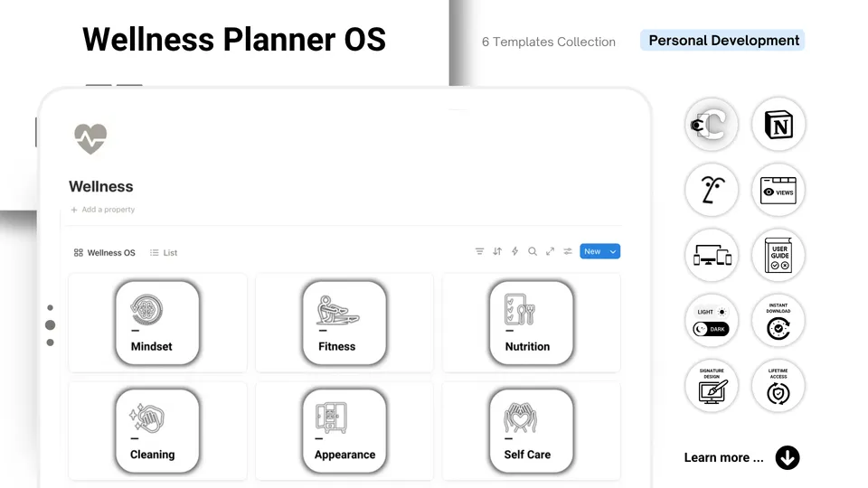 Whether you’re just starting your wellness routine or refining your self-care systems, this flexible workspace adapts to your lifestyle — with no pressure, no overwhelm, just balance.