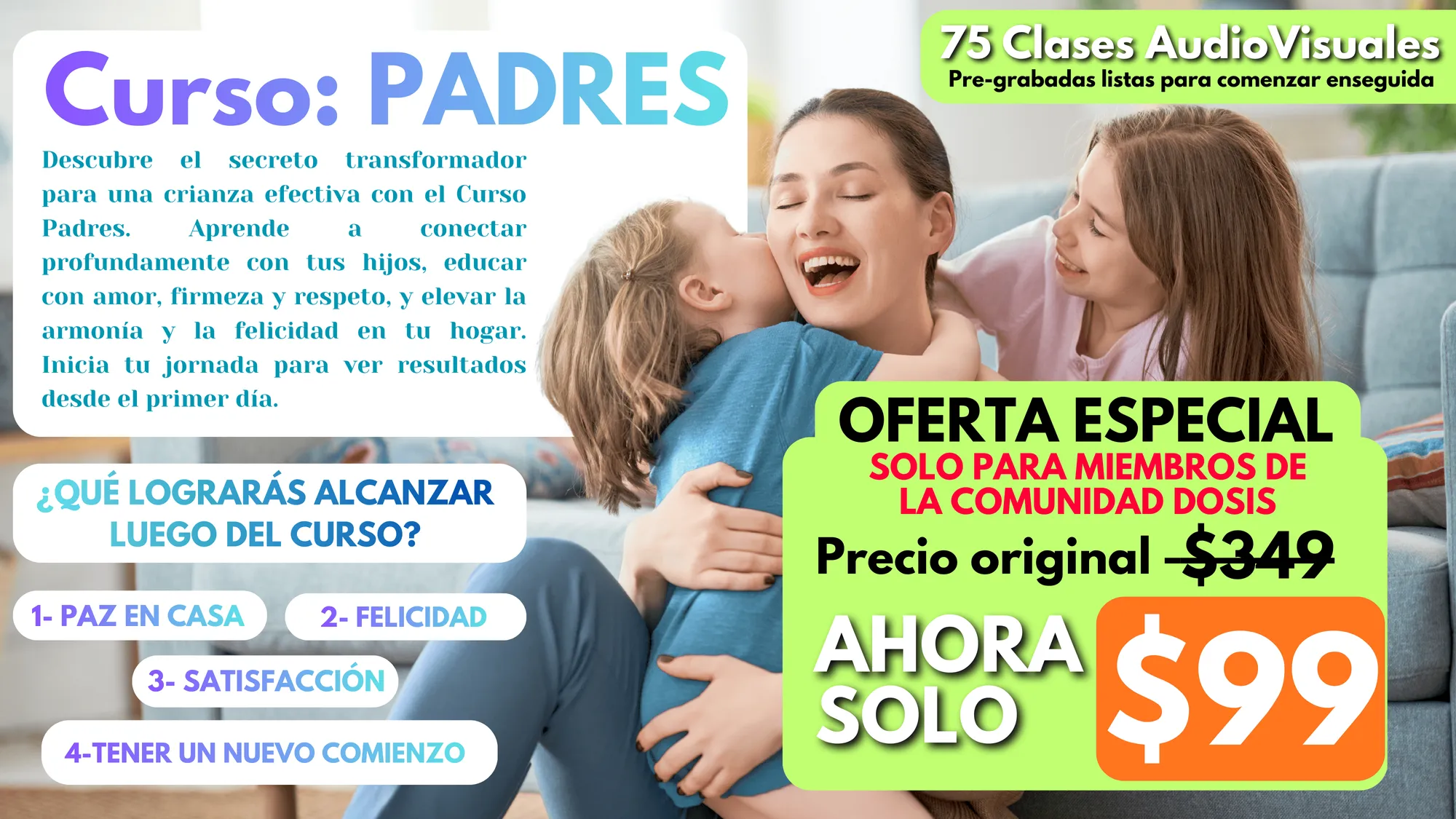 Empieza enseguida online el curso pre-grabado que ha ayudado a muchas familias a mejorar muchísimo la educación de sus hijos y tener una vida más feliz! ....... ¿QUÉ LOGRARÁS ALCANZAR LUEGO DEL CURSO? 1-"Paz en casa" ¡Siguiendo pasos simples, probados e increíblemente efectivos. 2-"Felicidad" Al darle a tus hijos herramientas que los impulsen y estimulen a descubrir esa grandeza innata que ellos tienen, permitiéndoles que puedan explotar al máximo su potencial para que se conviertan en esas personas exitosas y de bien, ¡¡¡ESO NO TIENE PRECIO!!!. 3-"Satisfacción" Transformar a tu hijo a través de hacerle ver su Innato Poder Interno. 4-"Tener un nuevo comienzo" Regálate un nuevo comienzo aplicando el sorprendente método de Disciplina Efectiva que cambia vidas.