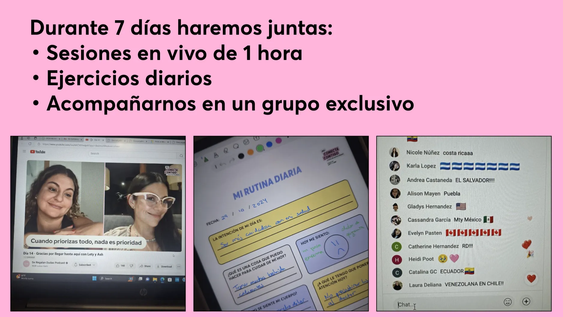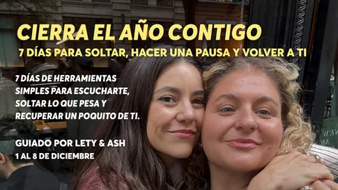 Durante una semana, vas a tener una hora diaria en vivo con Lety o Ash, donde juntas pondremos en práctica herramientas simples para escucharte, soltar lo que pesa y recuperar un poquito de ti.