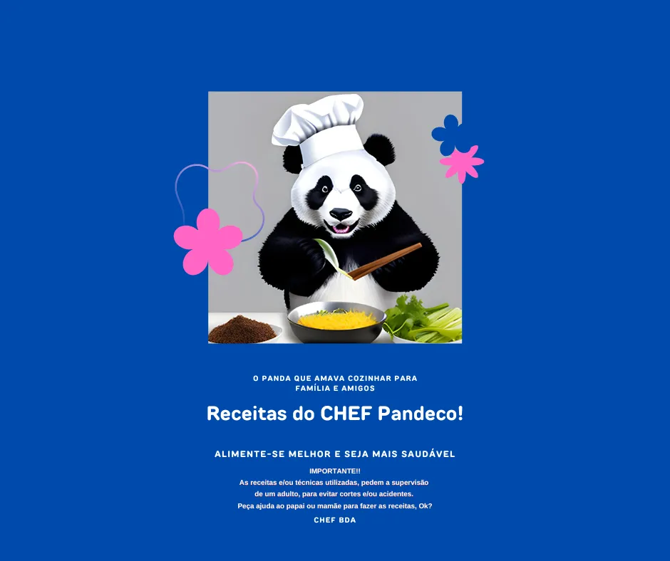 Pandeco, o panda CHEF, adorava cozinhar para amigos e família. Logo que percebeu o interesse de todos em sua forma de se alimentar mais saudável, resolveu escrever um livro de receitas. Espero que você se delicie com essas receitas aqui. E não se esqueça de pedir a supervisão de um adulto. Cozinhar com papai e mamãe é uma boa. Experimente!
