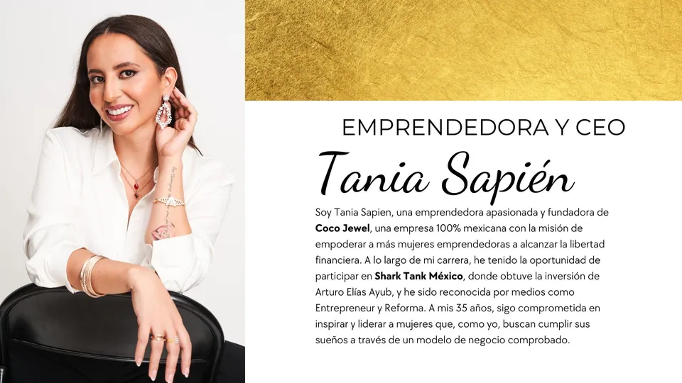 Soy Tania Sapien, una emprendedora apasionada y fundadora de Coco Jewel, una empresa 100% mexicana con la misión de empoderar a más mujeres emprendedoras a alcanzar la libertad financiera. A lo largo de mi carrera, he tenido la oportunidad de participar en Shark Tank México, donde obtuve la inversión de Arturo Elías Ayub, y he sido reconocida por medios como Entrepreneur y Reforma. A mis 35 años, sigo comprometida en inspirar y liderar a mujeres que, como yo, buscan cumplir sus sueños a través de un modelo de negocio comprobado.
