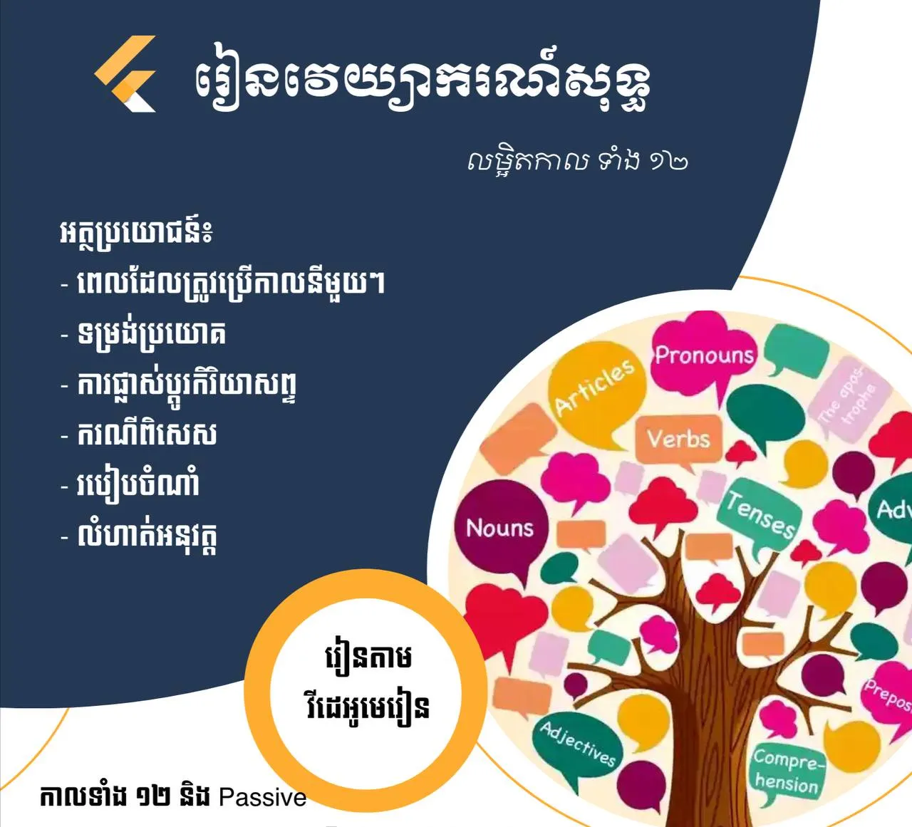 This course will explain you in detail about all 12 tenses in English and Passive (Present, Past, Future). Each tense includes: 1. Why? 2. What? - Form (Positive, Negative, Question) 3. How? - Examples 4. Special cases/exception 5. Tips to remember 6. Exercises