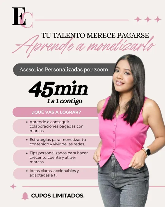 En esta sesión de 45 minutos, tendrás una asesoría personalizada en la que analizaremos tu perfil, contenido , estrategias actuales y contestaremos todas tus dudas. Te brindaremos consejos específicos y acciones a seguir para aumentar tus seguidores, mejorar tu contenido, maximizar las oportunidades de monetización y colaboraciones. Este es un espacio para discutir tus necesidades , tus dudas , tus preguntas y oportunidades únicas, asegurándote de estar en el camino correcto hacia lograr tus metas.