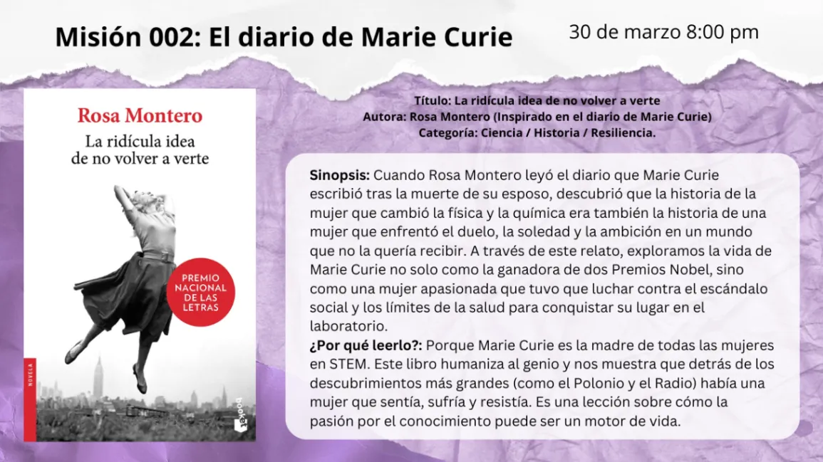 Un club de lectura para mujeres que desafían los límites de la ciencia y la tecnología. Únete a la comunidad de mujeres STEM que encuentran inspiración entre páginas.