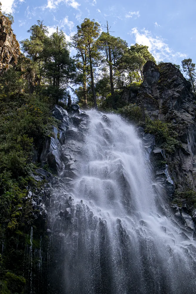 El Parque Ecoturístico Dos Aguas es una zona natural con bosque de coníferas, riachuelos y varias cascadas — como la famosa Cascada de los Diamantes que da nombre a la ruta — y espejos de agua para descansar y tomar fotos.