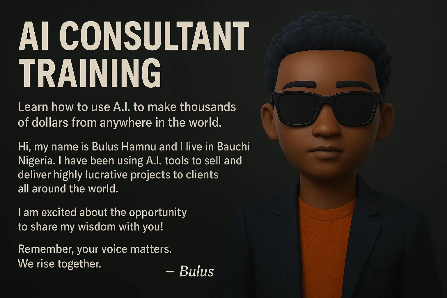 Learn how to use A.I. to make thousands of dollars from anywhere in the world. Hi, my name is Bulus Hamnu and I live in Bauchi Nigeria. I have been using A.I. tools to sell and deliver highly lucrative projects to clients all around the world. I am excited about the opportunity to share my wisdom with you! Remember, your voice matters. We rise together. -- Bulus