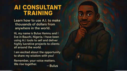 Hi, my name is Bulus Hamnu and I live in Bauchi Nigeria. I have been using A.I. tools to sell and deliver highly lucrative projects to clients all around the world. I am excited about the opportunity to share my wisdom with you! Remember, your voice matters. We rise together. -- Bulus