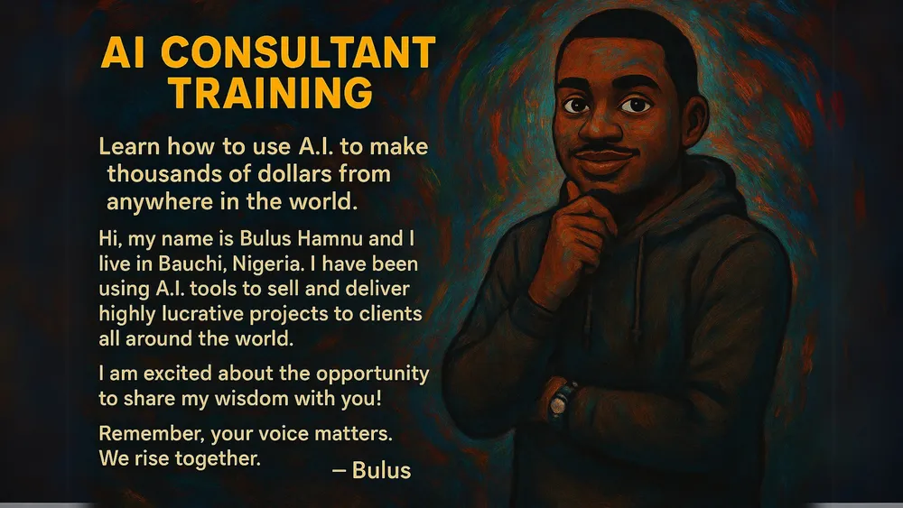 Learn how to use A.I. to make thousands of dollars from anywhere in the world. Hi, my name is Bulus Hamnu and I live in Bauchi Nigeria. I have been using A.I. tools to sell and deliver highly lucrative projects to clients all around the world. I am excited about the opportunity to share my wisdom with you! Remember, your voice matters. We rise together. -- Bulus