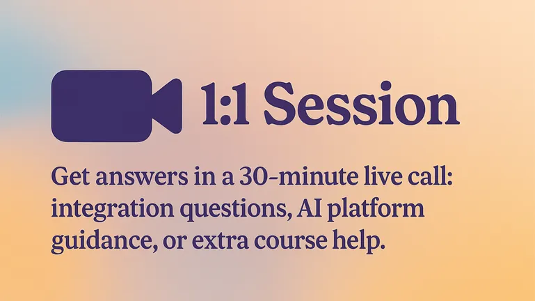 Book a 30-minute one-on-one session to get expert support on your current workflow, product integration questions, or anything you wish had been answered in a live class. Whether it’s AI tool advice, guidance on integrating documentation, or extra learning help — this session is your space to ask, explore, and grow confidently.