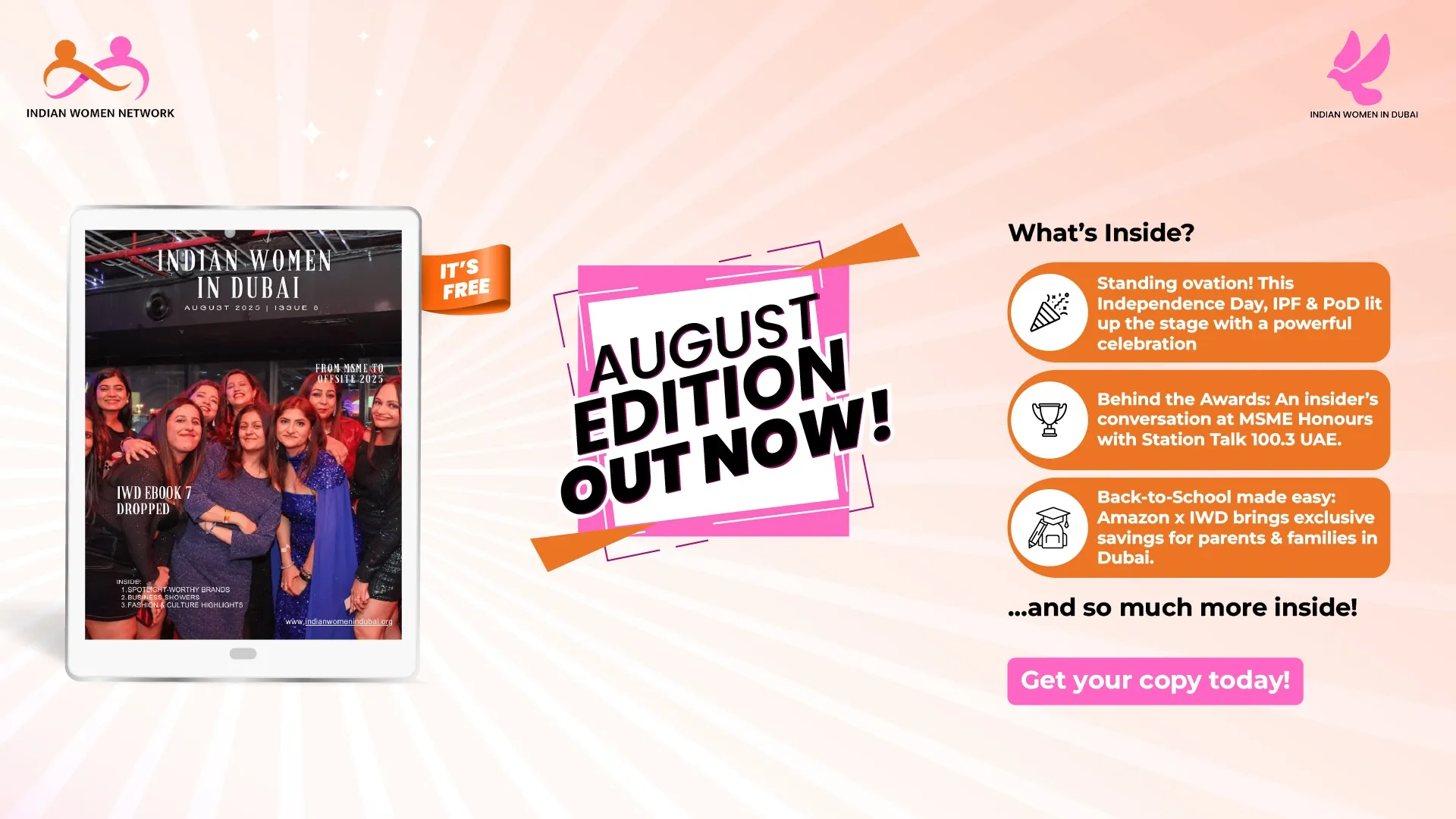 ✨ August Edition is OUT NOW… and guess what? It’s absolutely FREE! ✨ This month’s magazine is a full-on celebration of stories, success, and sisterhood—crafted just for YOU. 💃 📖 What’s inside? Standing Ovation Moments: Independence Day saw IPF & PoD light up the stage with a celebration of power, pride & patriotism 🇮🇳 Behind the Awards: An insider’s seat at the MSME Honours with Station Talk 100.3 UAE 🎤 Back-to-School Made Easy: Amazon x IWD collab bringing exclusive savings for parents & families in Dubai 🎒 … and pages filled with inspiration, collaborations, and community wins that will make you smile, nod, and maybe even tear up. The best part? You don’t have to spend a dirham. Just flip, scroll, and dive into a magazine that celebrates YOU and every incredible woman in our community. 💛 So what are you waiting for? Get your FREE copy today and be part of the stories that inspire, connect & empower. 📲 Click, read, and share it with your tribe—because good things are better when we enjoy them together.