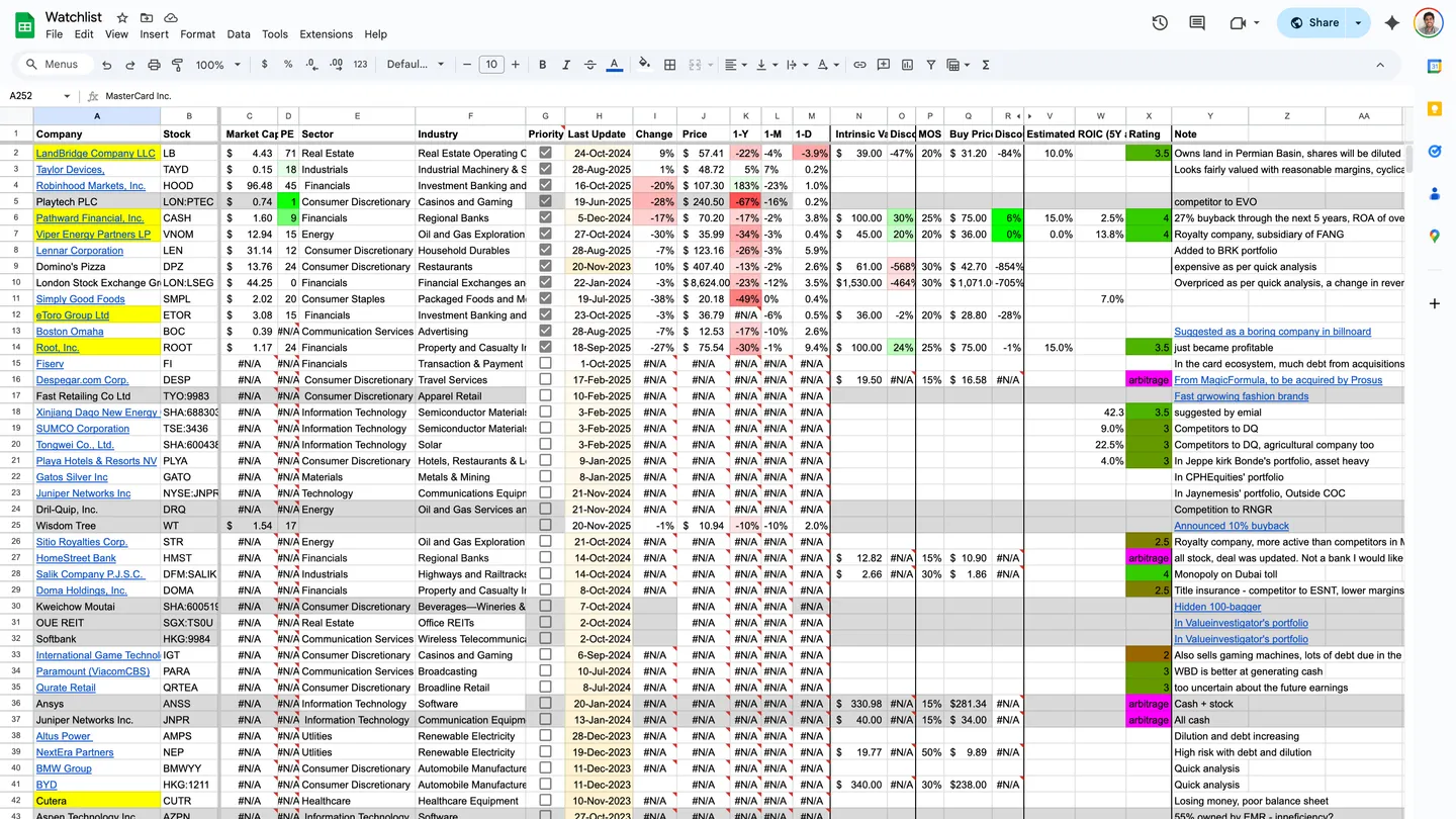 A live spreadsheet of every company I track—with my notes, conviction level, business snapshots, key metrics, and direct links to their analyses and valuations.