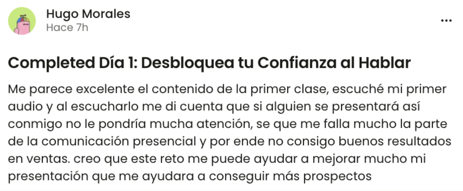 - Día 2: Tu Aliado Secreto: Un Asistente de IA que te da Feedback Real No es un chatbot genérico. Es un asistente entrenado para ayudarte a definir la idea central de tu logro y pulir tu mensaje hasta que realmente comunique tu valor. Te dará feedback personalizado y directo. No te va a soltar hasta que tu apertura capture atención desde el primer segundo.