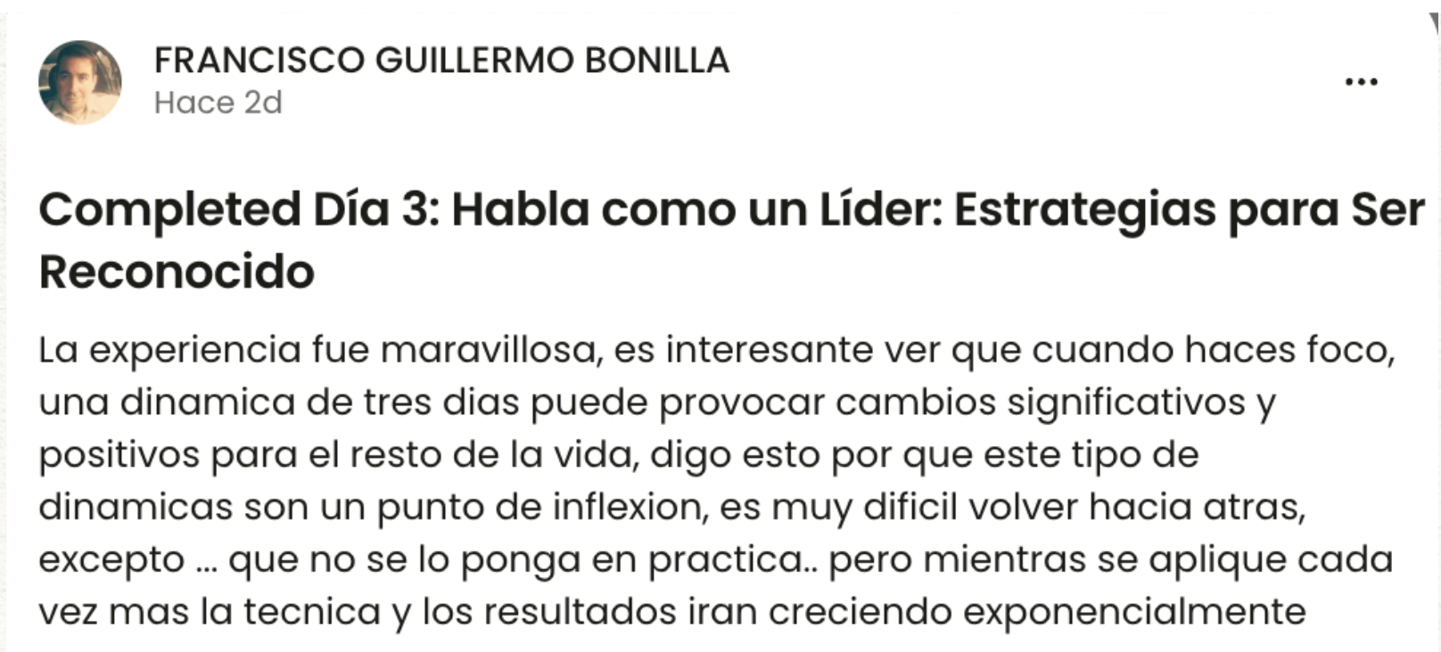 - Día 3: Habla como un Líder: Estrategias para Ser Reconocido Nos enfocaremos en tu Entrega Convincente. Aprenderás una técnica para practicar tu guion y comunicarlo con una seguridad auténtica, dejando una impresión duradera.