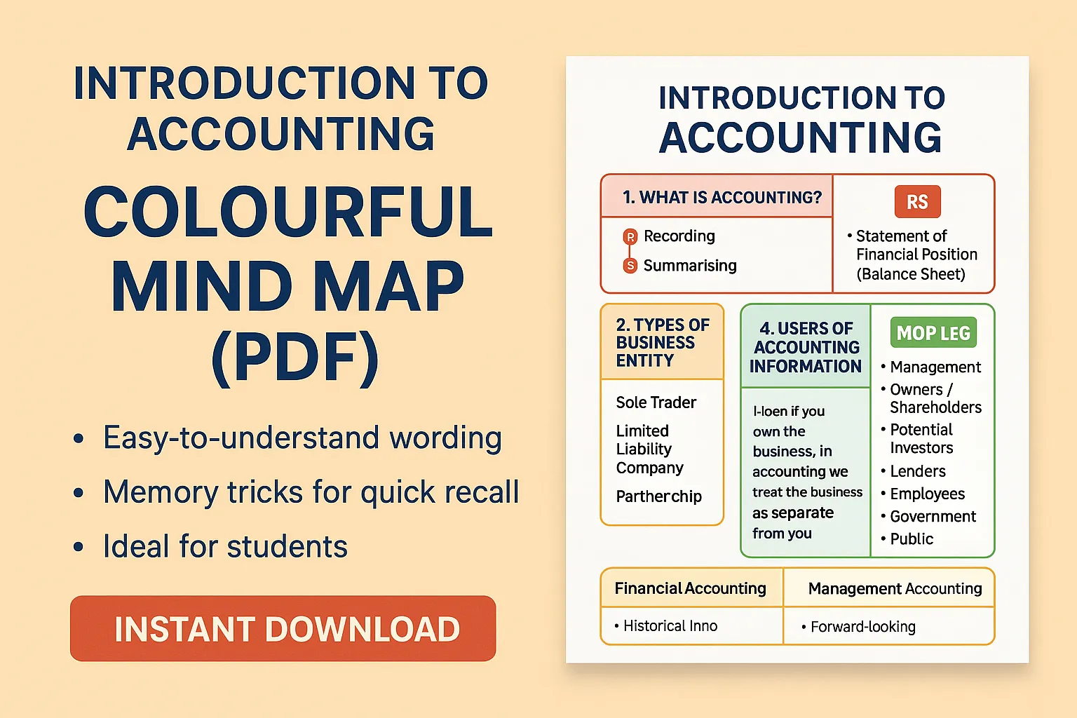 Struggling to remember accounting basics? This one-page, colourful mind map is your perfect study companion! Designed in clear UK English with easy-to-understand wording, it breaks down Chapter 1 into memorable parts like: ✅ RS – Recording & Summarising ✅ SLP – Sole Trader, Limited Company, Partnership ✅ MOP LEG – Key users of accounting information ✅ Clear comparison of Financial vs Management Accounting Why you’ll love this template: 🎯 Exam-friendly – Focuses on what you actually need to remember 🌈 Colour-coded – Visual learning makes memorising faster 🧠 Memory tricks included – RS, SLP, MOP LEG for quick recall 📄 One-page format – Perfect for quick revision before exams 💼 Suitable for all learners – From beginners to ACCA/Business students Whether you’re preparing for exams, job interviews, or just starting your accounting journey, this mind map will save you hours of note-making and help you learn smarter, not harder. 📥 Instant PDF download – print or keep on your device!