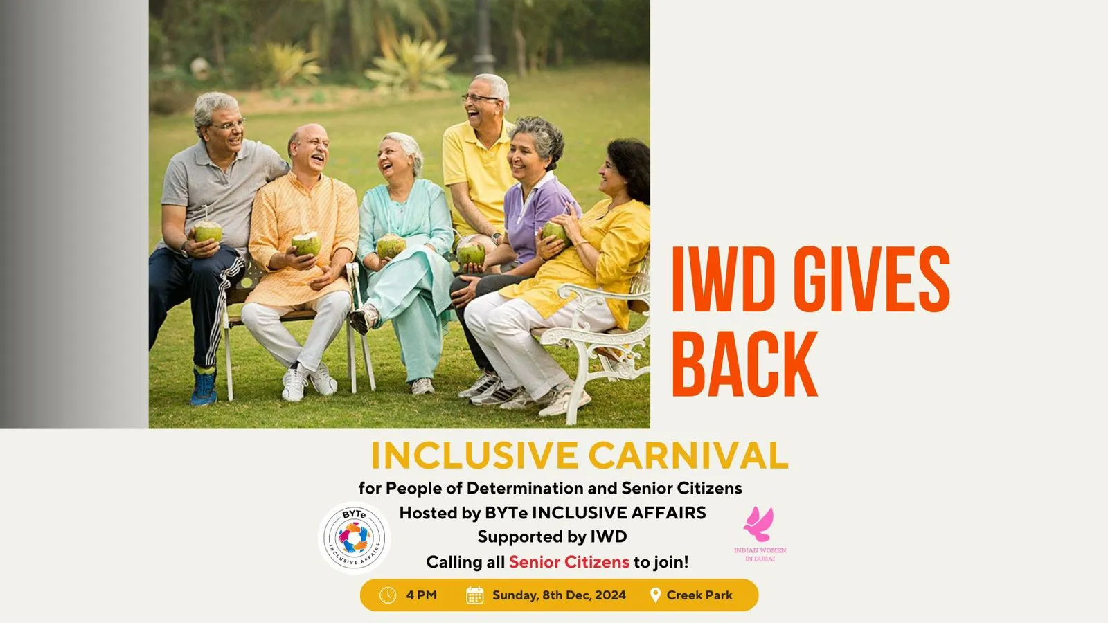 Calling all our lovely Senior Citizens - Join us for the Inclusive Carnival πͺ organized by BYTe Inclusive Affairs, and supported by Indian Women in Dubai!