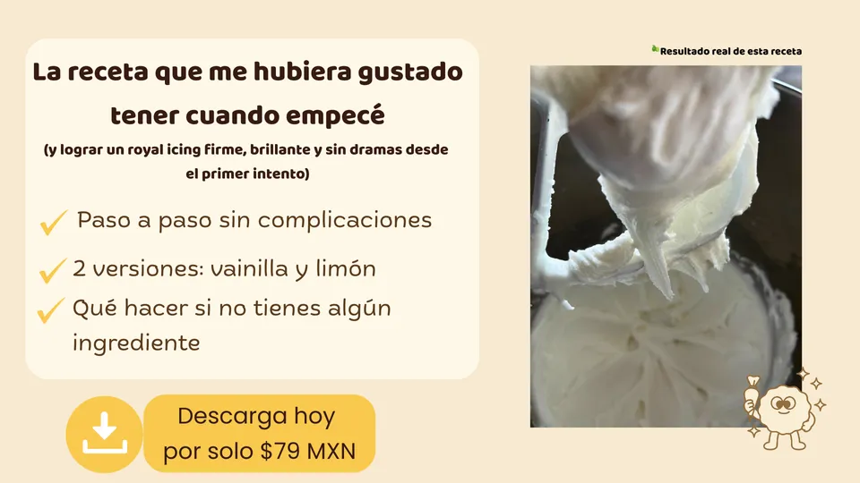 Haz un glaseado firme, brillante y sin dramas… desde el primer intento. Una receta simple y confiable para decorar galletas sin frustrarte en el proceso. ¿Tu royal icing queda demasiado líquido, demasiado duro o simplemente no te sale bien? No eres tú. No es falta de talento. Es que nadie te enseñó una fórmula que simplemente funcione. La historia detrás de esta receta Cuando me mudé a Coatepec, algo raro empezó a pasar: El royal icing de limón que siempre me funcionaba… ahora se volvía transparente. La galleta absorbía el glaseado. Perdía color, textura, y mi paciencia. Probé mil ajustes. Ninguno servía. Hasta que encontré una fórmula que sí me dio el resultado que buscaba: Brillante, estable, y sin dramas. Esa es la receta que hoy te comparto. ¿Qué es esta fórmula? “La Fórmula Anti-Frustración del Royal Icing” es un PDF descargable, pensado para decoradoras aficionadas que aman hornear, pero sufren cuando toca hacer royal icing. Sin tecnicismos. Sin ingredientes raros. Sin tener que aprender química de alimentos. Solo una receta clara, explicada con cariño, que puedes aplicar hoy mismo con lo que tienes en casa. ¿Qué incluye? ✅ Receta paso a paso (en dos versiones: vainilla y limón) ✅ Explicación simple de cada ingrediente (sin lenguaje técnico) ✅ Tips para evitar errores comunes antes de que pasen ✅ Tablas listas para hacer más cantidad sin hacer cuentas ✅ Consejos de conservación y secado, incluso en climas húmedos ✅ Opciones si te falta algún ingrediente (no te frenes por eso) Todo lo que me hubiera gustado tener cuando empecé. Precio y acompañamiento 💸 Costo: $79 MXN Pago único. Acceso inmediato. ¿Y si no me sale como esperaba? Tienes 7 días para probar la receta. Y si no consigues un glaseado firme, escríbeme directo. Te ayudo paso a paso a resolver lo que no esté funcionando. Aquí no vendemos fórmulas mágicas. Pero sí te acompaño a que la magia te salga ✨ ¿Lista para dejar atrás el glaseado que no coopera? ➡️ Descarga la receta por solo $79 MXN (Acceso inmediato. Sin membresías. Sin dramas.)