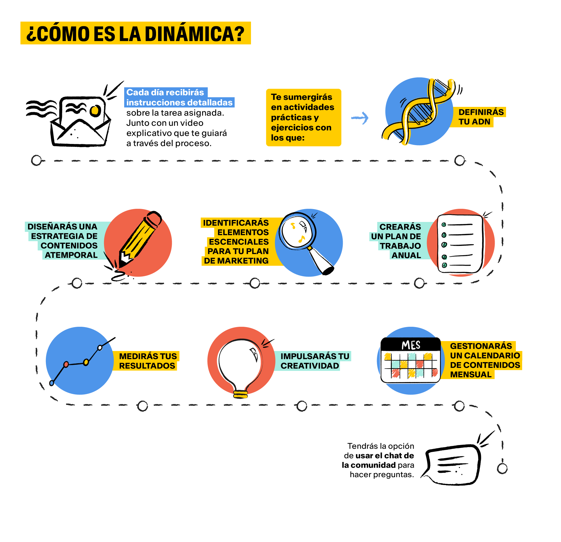 El marketing no es necesariamente una actividad complicada, pero puede resultar desafiante trazar un plan que te ayude a alcanzar tus objetivos. Es por eso que te invito a enfrentar este reto juntos. En solo una semana, trabajaremos en conjunto para superar esos obstáculos a los que te enfrentas ahora mismo y lograr tus metas musicales.