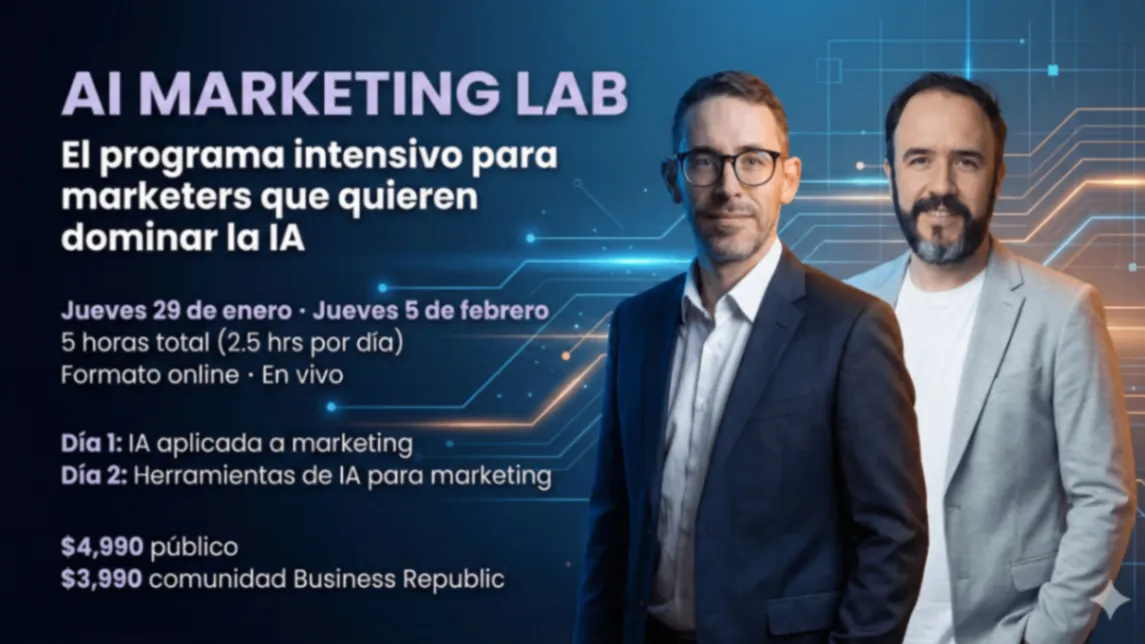 AI Marketing Lab es un programa intensivo, 100% práctico y estratégico, diseñado para marketers, emprendedores y líderes de negocio que quieren aplicar y usar la IA en su forma de pensar, planear y ejecutar marketing, sin humo, sin teoría innecesaria y con aplicaciones reales desde el primer día.