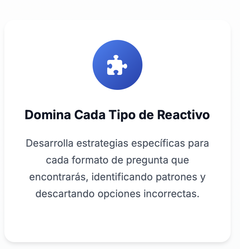 Evolucionarás de responder preguntas intuitivamente a dominar estrategias específicas para cada tipo de reactivo. Aprenderás a identificar patrones ocultos, descartar opciones incorrectas sistemáticamente, y seleccionar la respuesta óptima incluso en situaciones de incertidumbre.