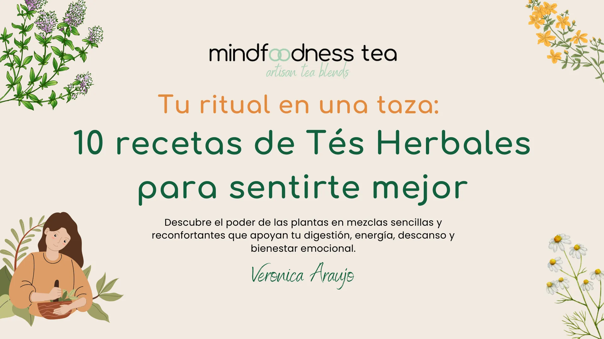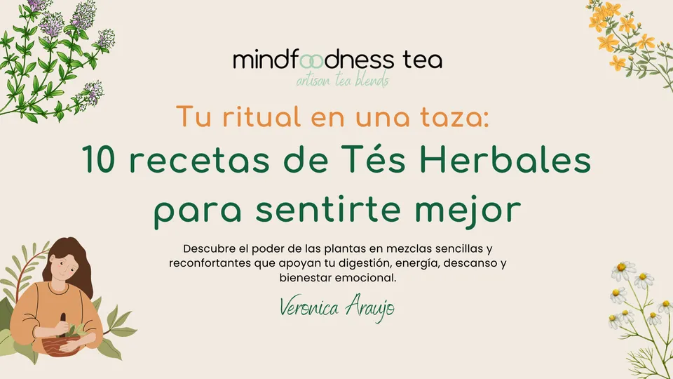 Esta guía gratuita te comparte 10 recetas de infusiones herbales sencillas y efectivas, creadas por la herbolaria Verónica Araujo, fundadora de Mindfoodness Tea.