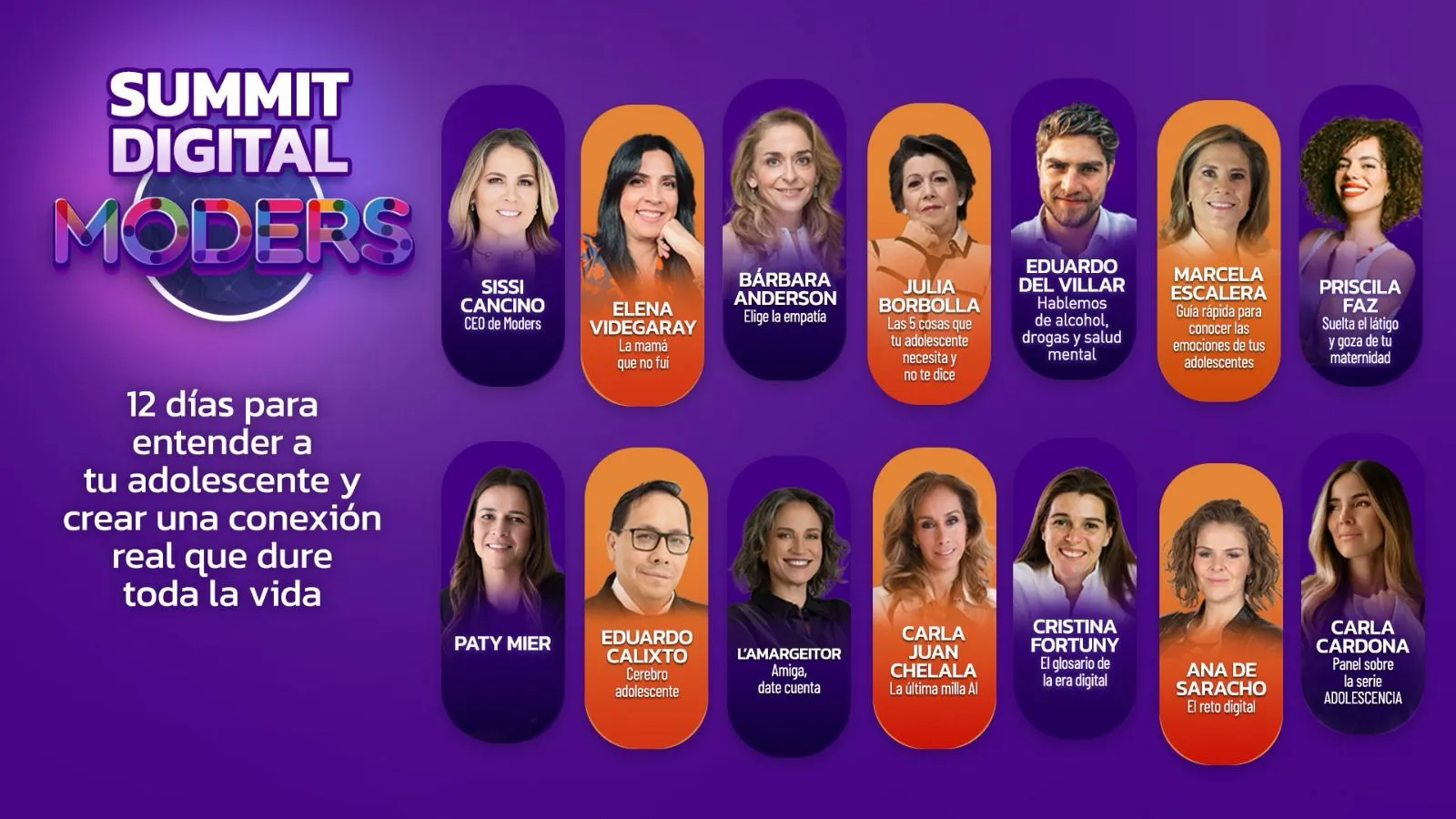 Hemos estado en más de 14 ciudades de México y Estados Unidos. Y para ti, que no has podido acompañarnos, o que quieres revivir estas conferencias, hemos creado el MODERS Summit Digital, un evento que a lo largo de 12 conferencias te ayudará a descubrir y entender lo que pasa en el mundo adolescente: cómo funciona su cerebro, qué ocurre en las redes sociales, cómo lidiar con la inteligencia artificial, cómo nos sentimos las mamás en el día a día, cómo comunicarnos efectivamente con ellos, como vincularnos, cómo lograr un equilibrio entre su vida real y digital.