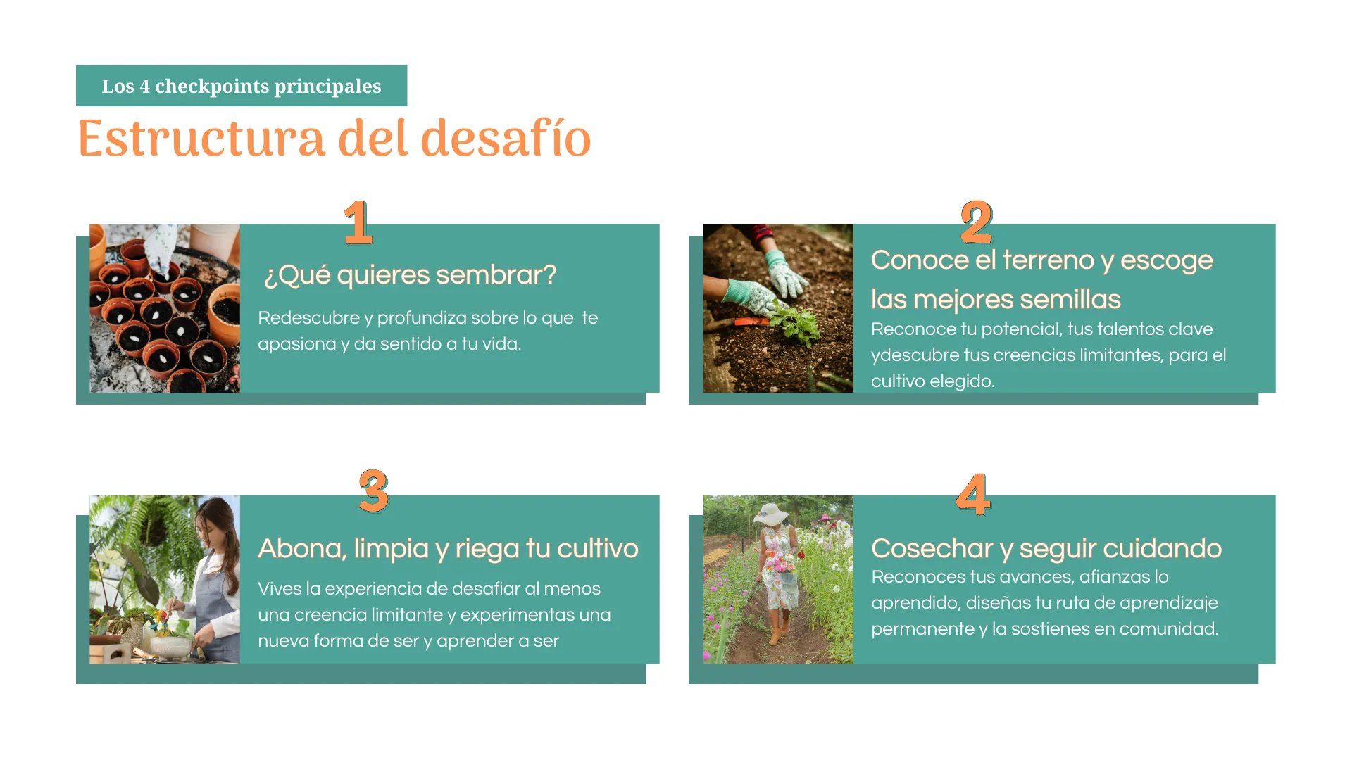 El desafío está estructurado con 4 checkpoints principales que marcan la temática de cada semana. Y Su inicio coincide con los encuentro grupales vía Zoom.