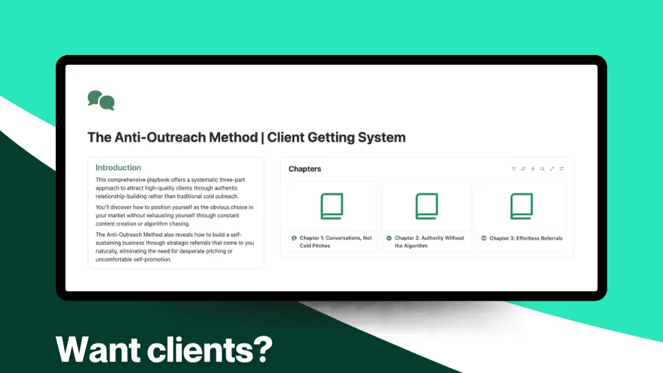 This comprehensive playbook offers a systematic three-part approach to attract high-quality clients through authentic relationship-building rather than traditional cold outreach.
