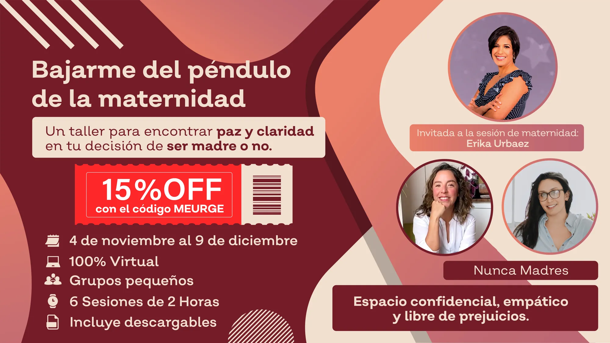 Este taller de seis sesiones virtuales 💻 está pensado para mujeres que buscan claridad, paz y ser escuchadas, que no quieren sentirse atrapadas ni solas en el proceso de decidir si maternar o no.