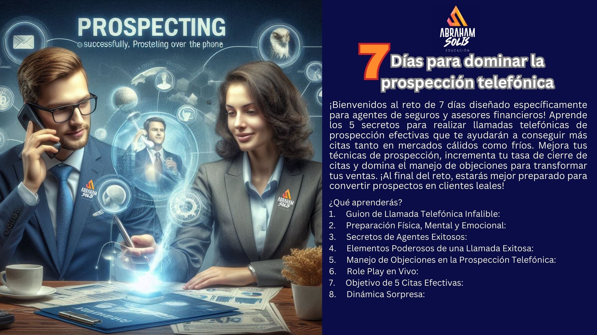 ¡Bienvenidos al reto de 7 días diseñado específicamente para agentes de seguros y asesores financieros! Aprende los 5 secretos para realizar llamadas telefónicas de prospección efectivas que te ayudarán a conseguir más citas tanto en mercados cálidos como fríos. Mejora tus técnicas de prospección, incrementa tu tasa de cierre de citas y domina el manejo de objeciones para transformar tus ventas. ¡Al final del reto, estarás mejor preparado para convertir prospectos en clientes leales!