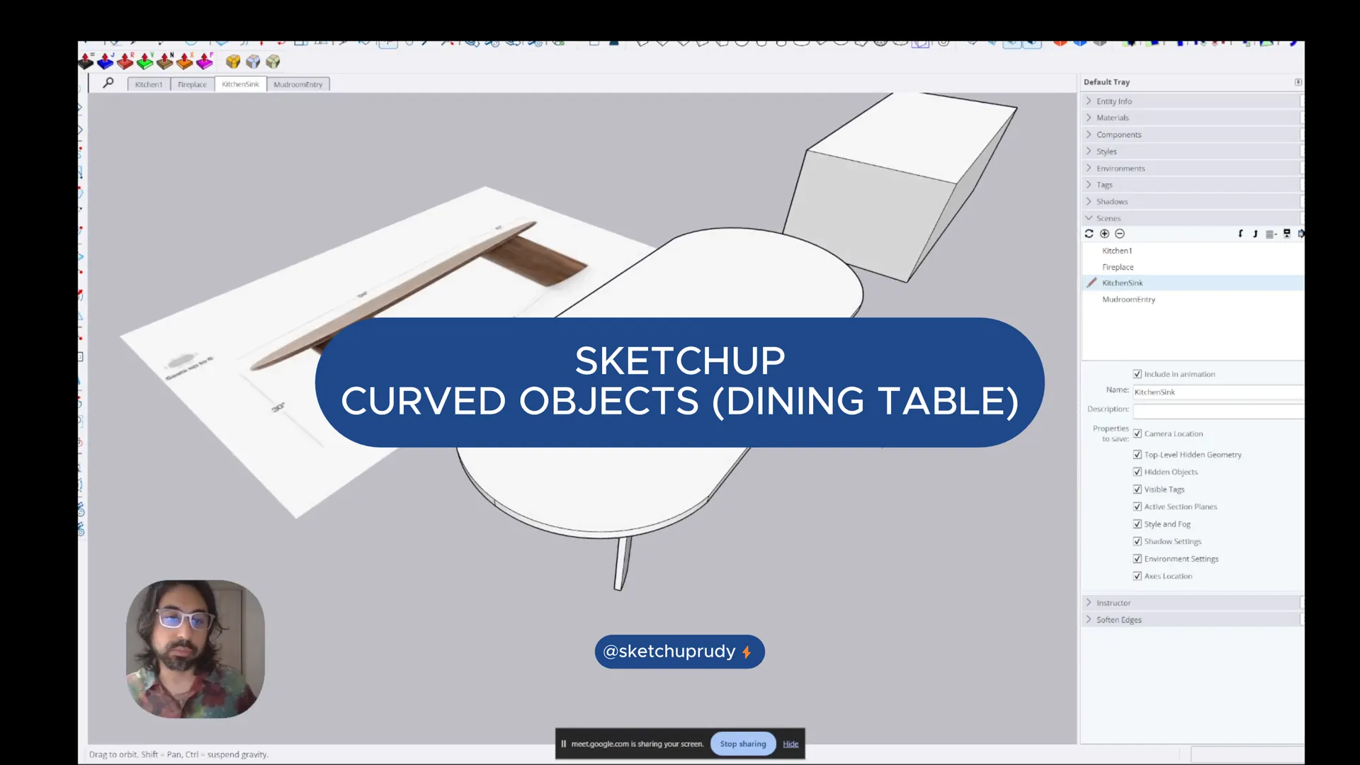A tutorial from a live session showing how to create curved objects with the arc tool, in this case a dining t able with rounded ends and legs.