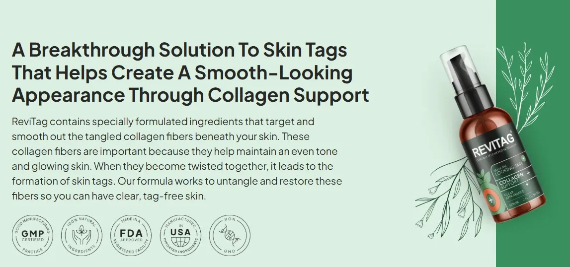 ReviTag is a natural, non-invasive serum designed to eliminate skin tags and improve overall skin health. Formulated with plant-based ingredients, it targets the root causes of skin tags by addressing tangled collagen fibers beneath the skin's surface. Manufactured in FDA-registered and GMP-certified facilities in the USA, ReviTag offers a safe and effective alternative to surgical or chemical treatments.