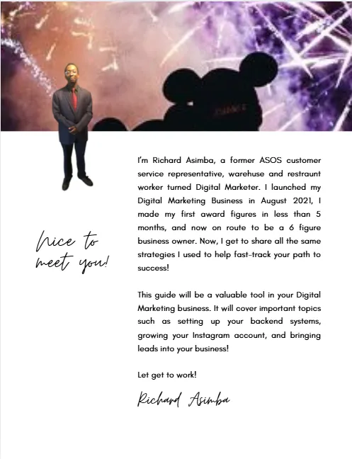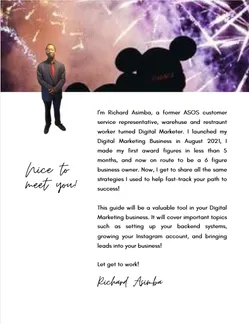 You access everything that I've used to grow my followers to over 10k and get the first 1000 people on your email client list and become an award winning makerter. So that you can start making $500/day within the next 30 days. In-depth Viral Content Ideas for a FULL month that you can use to increase engagement on your Instagram account fast. 4 weeks of Reels (including hooks and captions) to plug and play, and go viral consistently. How to create your own Irresistible digital product that customers are going to be lining up for. How to set up your Instagram account in a way that builds trust and converts strangers to long-time buyers in 48 hours. 54+ Bonus Reel Hooks built on secret attention-grabbers that double your watch time. 18 Reel covers and sales-accelerating Instagram Stories templates to increase views and make sales with minimal effort. Done-For-You Faceless content with amazing aesthetics and bonus hooks, captions, CTAs, etc. The best times to post, SEO and hashtags on Instagram that “digital marketing experts” do NOT want you finding out about. Instagram growth hacks that you can start implementing just like I did to add over 100K+ followers every month. Rights to Modify and RESELL the guide for 100% profits. AND SOO MUCH MORE...
