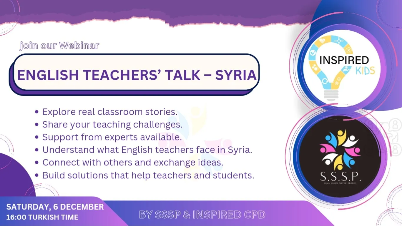 Join us for a dedicated session created for English teachers across Syria. This webinar is a safe, open space to share your real experiences , what is happening in your classrooms, the challenges you face, and the needs of your students and communities.