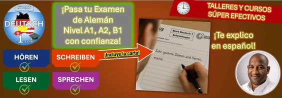 ¿Estás a punto de intentar (de nuevo) aprobar el examen de alemán de nivel A1, A2 o B1? ¿No estás seguro de tu nivel de preparación para el examen? Rellena este formulario para encontrar tu mejor opción: sesiones rápidas de talleres virtuales para aprender a aprobar el examen, explicadas en español, que te permitirán dominar las secciones "Hören", "Lesen", "Schreiben" (incluida la temida carta) y "Sprechen" del examen: cómo presentarte, hacer y responder preguntas, dar instrucciones [Nivel A1], o bien presentarte, responder a preguntas de seguimiento, planificar algo juntos, justificar tu opinión, describir una imagen [A2, B1], ¡o las cuatro secciones a la vez! El taller se crea y la fecha se fija en función de la demanda. Estas clases también se pueden tomar junto con tus clases habituales para una mejor preparación. Los grupos están limitados a un máximo de 15 participantea. Descargo de responsabilidad: Estas clases > no sustituyen < a las clases y exámenes oficiales de Goethe/telc; sin embargo, están pensadas para prepararte para estas clases y exámenes formales.