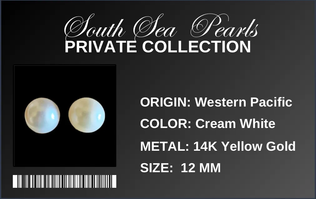 -Yellow Gold setting creamy white south sea pearls in classic stud design.