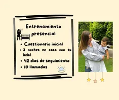 ¿Quieres entrenar a tu bebé pero temes no lograrlo? ¡No te preocupes! Yo puedo hacerlo por ti. Con este entrenamiento, te facilitaré las cosas en un 70%, te lo prometo. Durante tres noches, me quedaré con tu bebé en su cuarto y yo me haré cargo durante cada despertar nocturno mientras tu descansas. Observaré y tomaré la acción y el método que tu bebé necesita. Después de las tres noches, te acompañare y guiaré de forma remota durante 42 días más. Además, tendrás 10 llamadas conmigo durante el proceso. Los precios aplican para personas que viven dentro de la CDMX. En caso de requerir el servicio fuera de el área, se cobrarán viáticos (transporte, hotel y comidas) a parte. ¡Confía el sueño de tu bebé! Tenemos una taza de éxito del 92%. Por favor, al adquirir este paquete, da click en el enlace abajo para contestar el cuestionario inicial y comenzar el camino hacia el descanso.