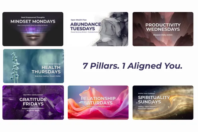 ✔️7 life gateways: mindset, abundance, action, health, relationships, gratitude, inner alignment