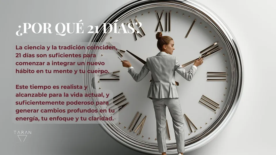Los estudios muestran que 21 días son suficientes para formar un nuevo hábito. Este tiempo es realista para tu vida diaria y suficientemente poderoso para generar cambios profundos. Y si al terminar decides continuar hasta los 40 días, estarás multiplicando la integración y expansión de esta experiencia.